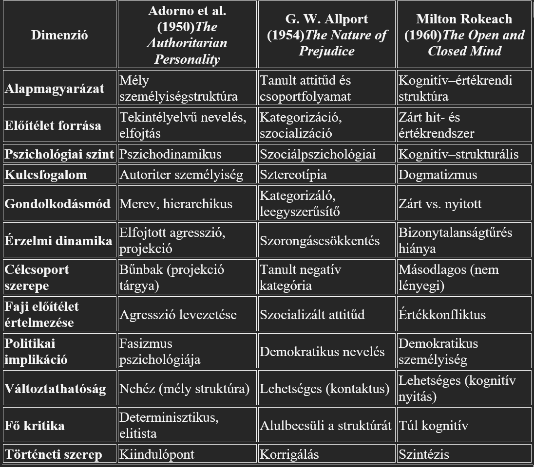 A harmadik megközelítés a zárt gondolkodással magyarázza az előítéletet. Rokeach szerint például nem a bőr színe határozza meg a két ember közti távolságot, hanem az, hogy mennyire gondolkodnak nyitottan vagy zártan, és az, hogy hasonlóak-e az értékeik. De a társadalmi státuszkülönbségnél is felvethető lenne, hogy itt sem korrelál az intelligencia a társadalmi státussal. Mégis, ebben a vonatkozásban a legérdekesebb a mi miniszterünk, mert Rokeach megkülönbözteti az elit előítéletességét a hátrányos helyzetűek előítéletességétől. Például az elit előítéletessége paternalisztikus. Nem akar rosszat, de rá akarja kényszeríteni az alacsony státusúra a maga nézőpontját, a maga normáit. Lázár János nagyon is beleilleszthető ebbe a körbe, és a Fidesz is. A „be kell tartanod a mi normáinkat” (ilyen szövegeket plakátokon is láttunk) tipikusan zárt gondolkodású elitista előítélet.